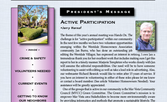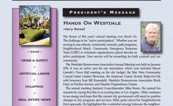 Inside the Spring 2016 edition (.pdf): LAPD Goals WHOA Membership Getting to Know your Neighbors Real Estate News Plane Traffic over Mar Vista Block Party Help Needed Park Report Westdale Ads