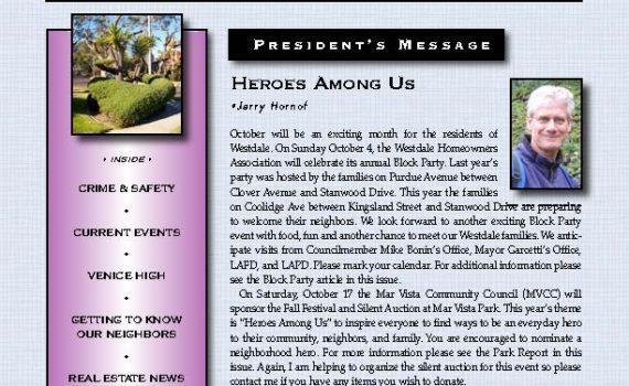 Inside the Fall 2015 edition (.pdf): Crime & Safety Current Events Venice High Getting to Know your Neighbors Real Estate News Neighborhood Prosecutors Park Report Westdale Ads